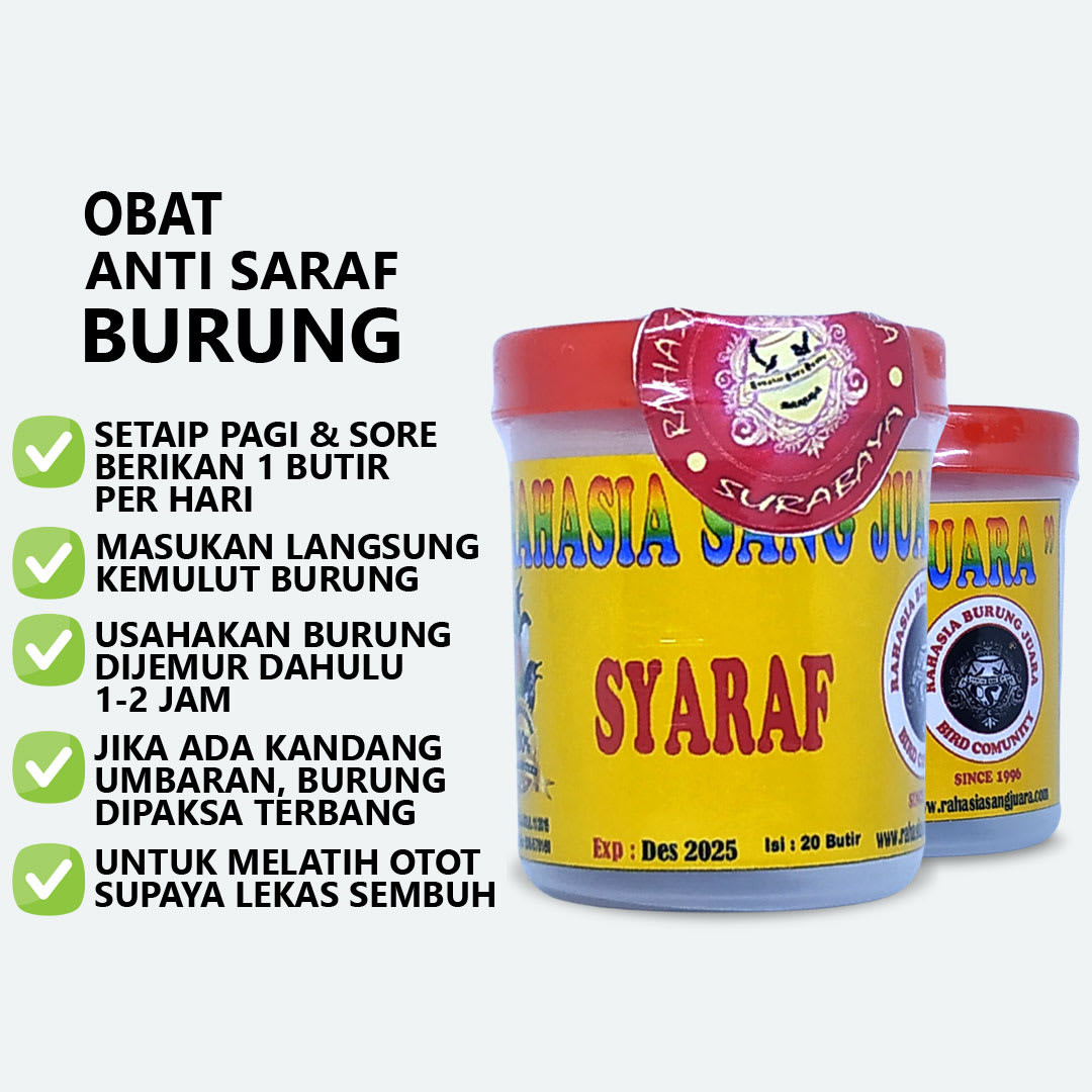 Anti Syaraf Burung merupakan obat saraf burung kenari, cucak ijo, kacer, murai batu, lovebird, pleci dan burung lainnya. Ampuh mengobati gejala gangguan saraf pada burung seperti burung kaki lumpuh, burung tetelo, burung turun sayap dan gangguan saraf lainnya.